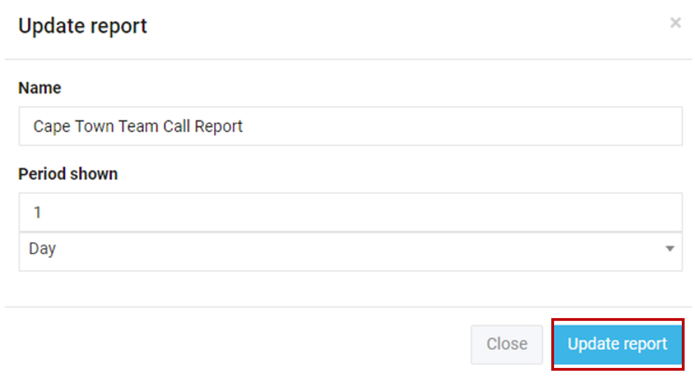 Your previous report settings will remain unchanged as can be seen below, where selecting 0 for the current period, and 1 for the previous period shown. Select Update report to continue.