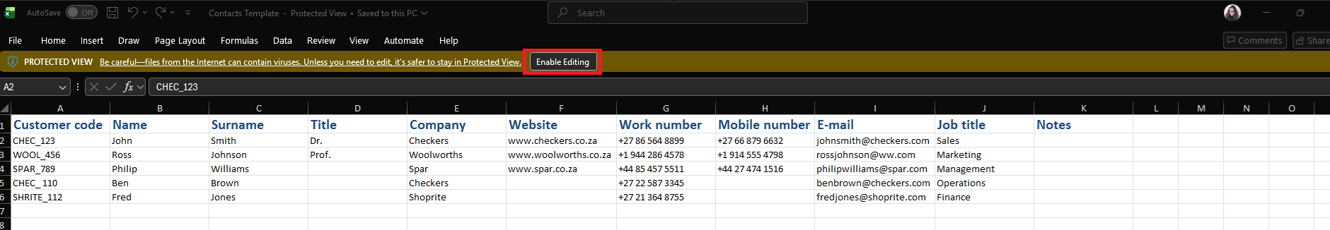 1. Open the attached template in Excel and click Enable Editing at the top: