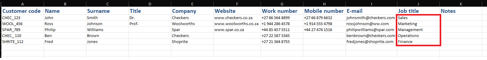 2. Fill out your template with at least one contact for each new job title you wish to add. For example: