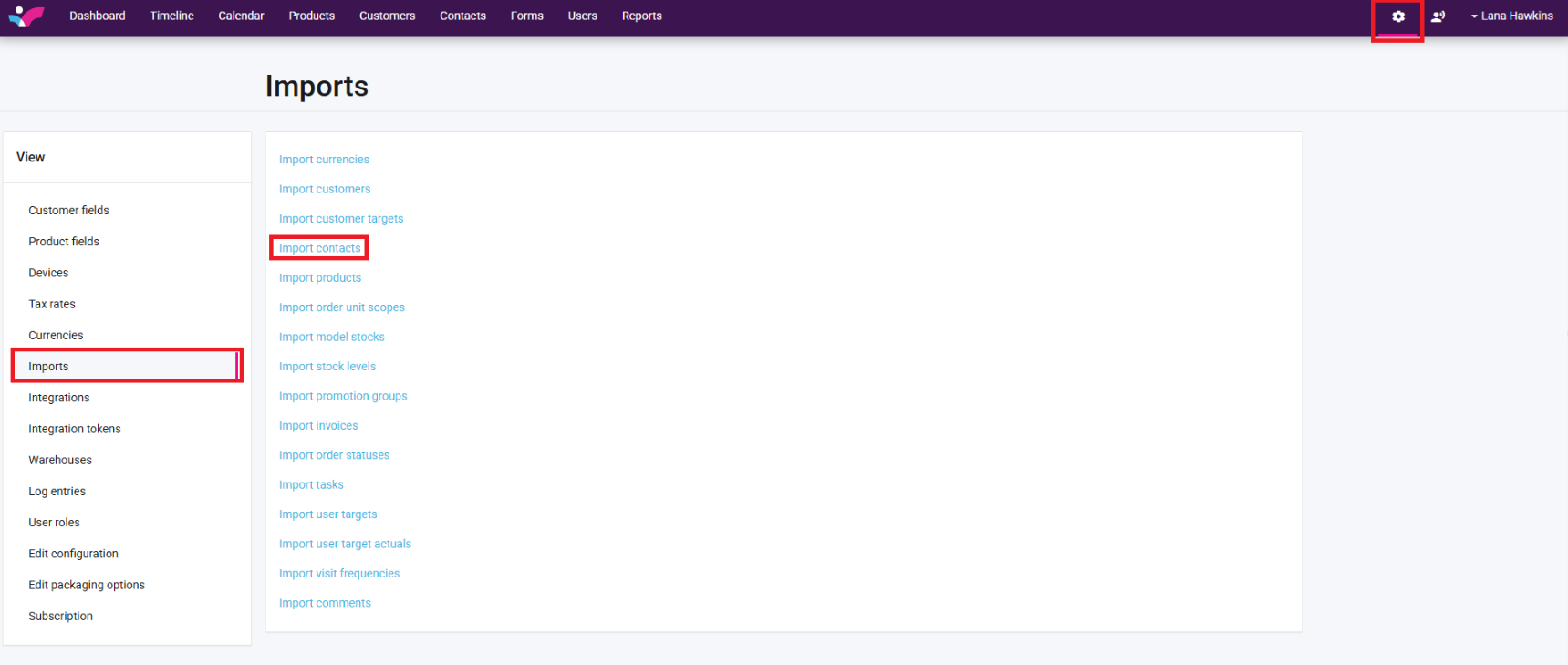 3. On your Skynamo web interface, click on the Settings icon in the top-right corner -> Imports -> Import Contacts: