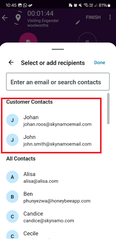 #4. When you the do a visit or order, or form, and select your email field, the contact you added will be listed at the top of the contacts list for each respective customer.