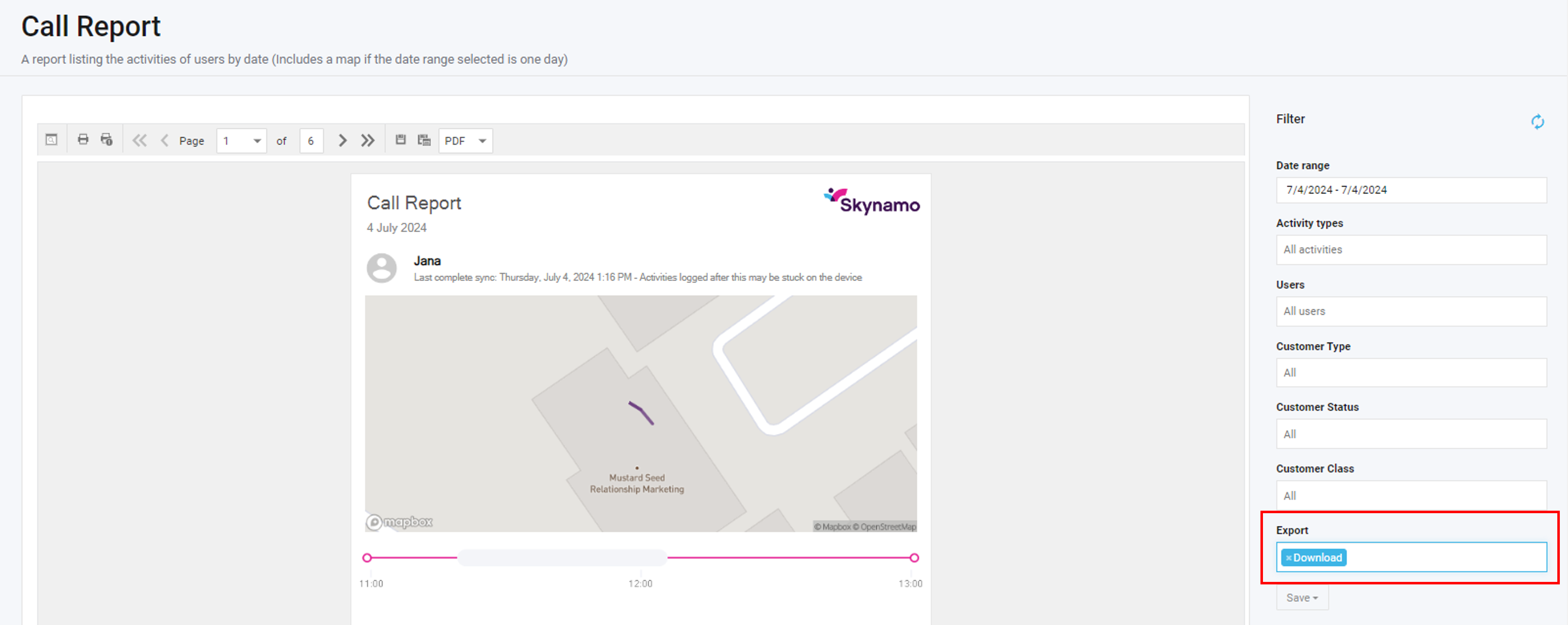 Navigate to Skynamo > reports > call report and apply the "download" option to the customer field we created: