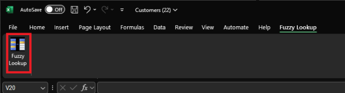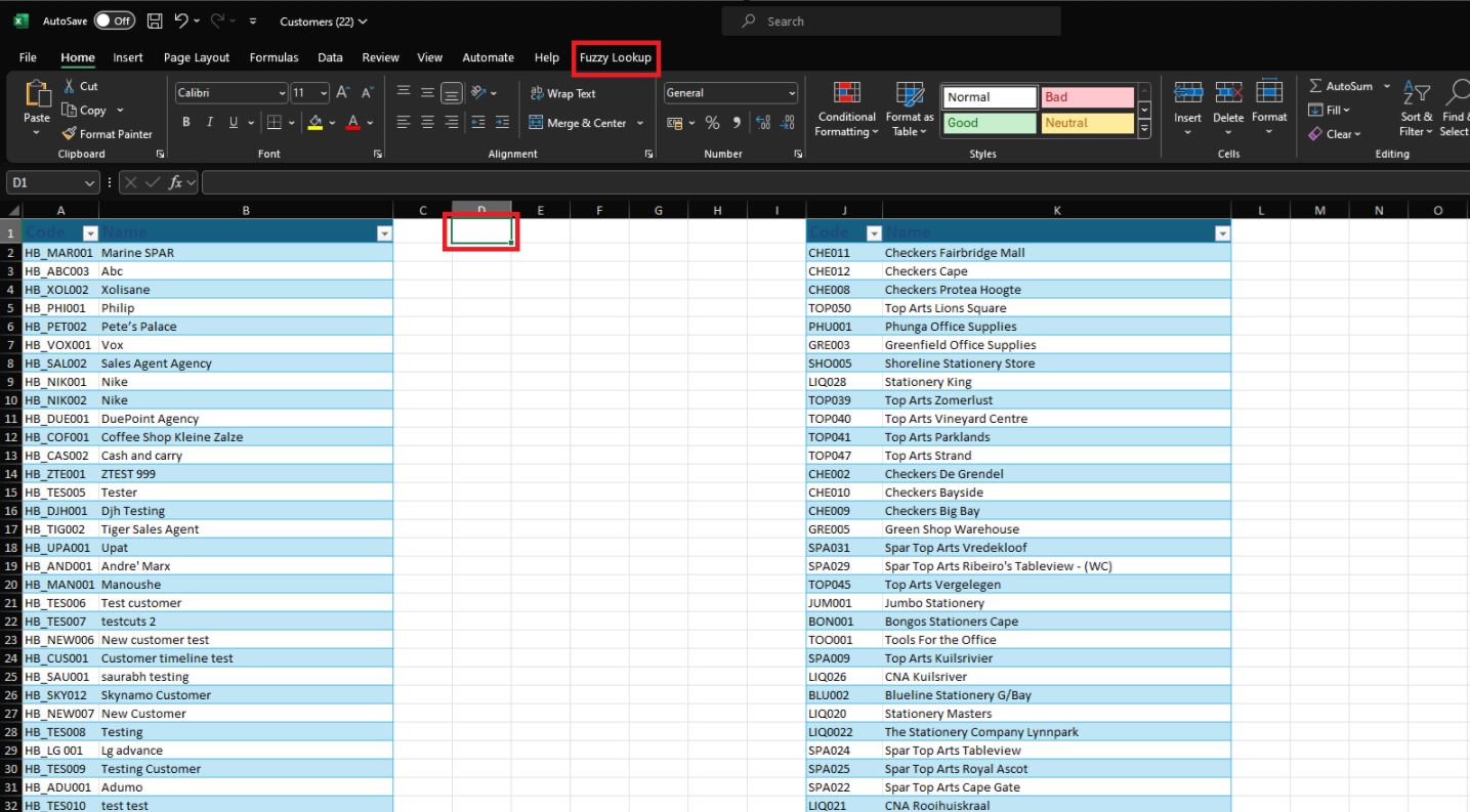 Click in D1 with your cursor, as this is where the Fuzzy Lookup data will be populated. Then, click Fuzzy Lookup at the top: