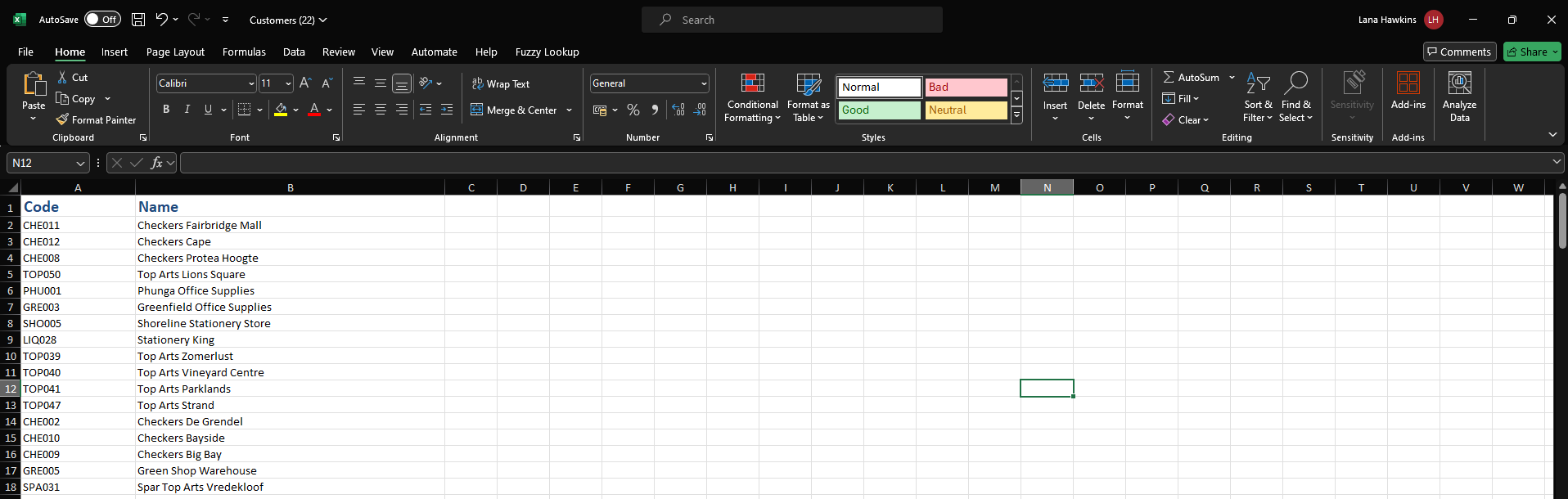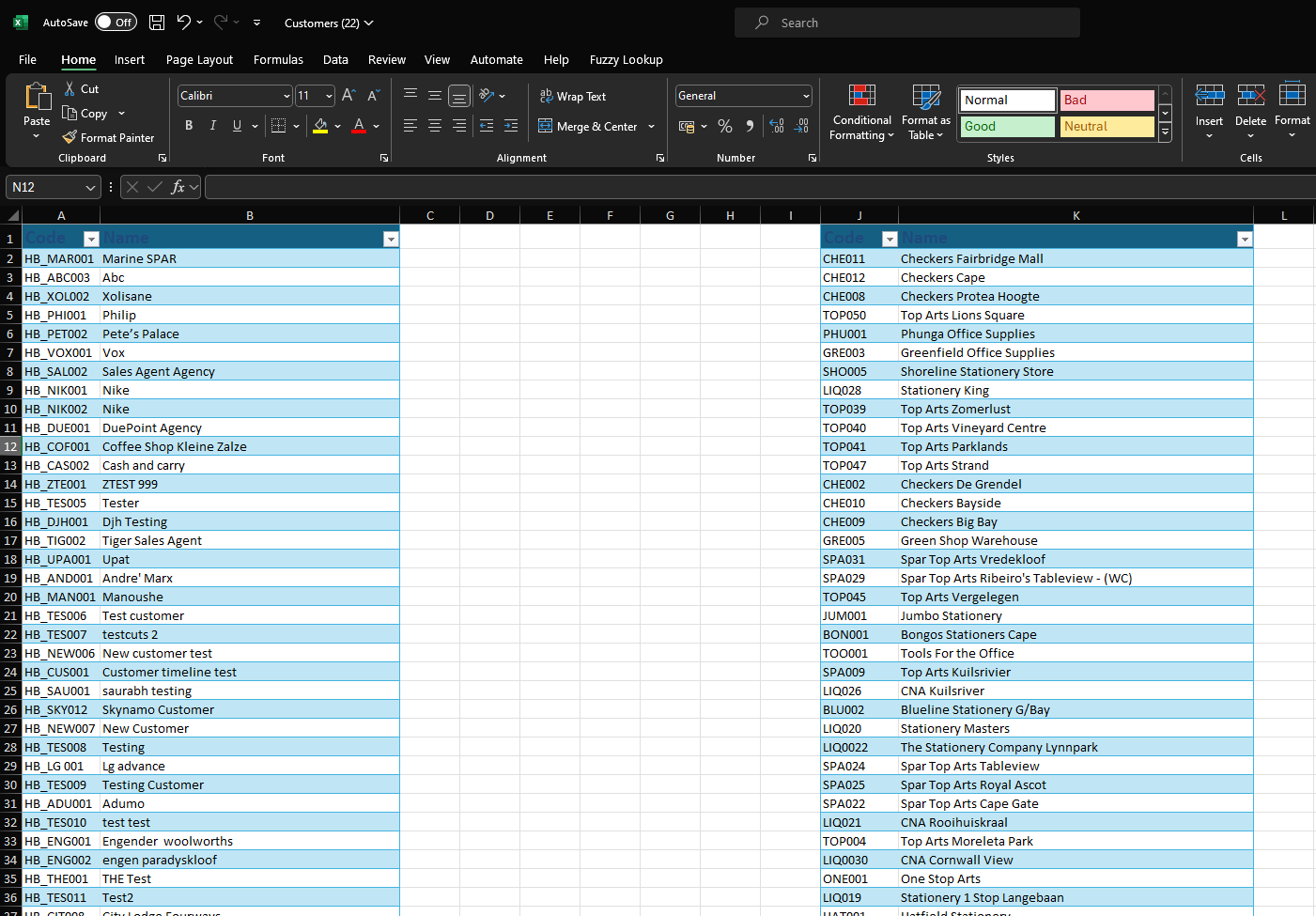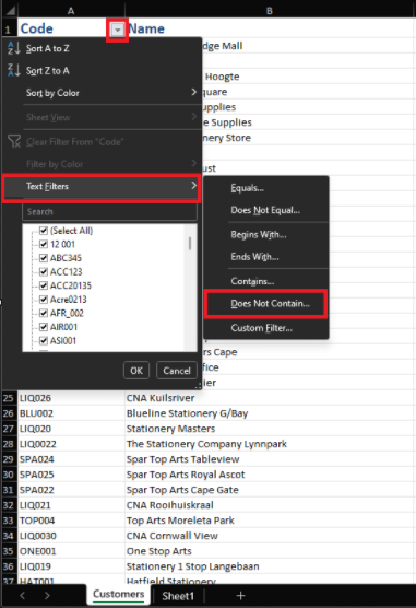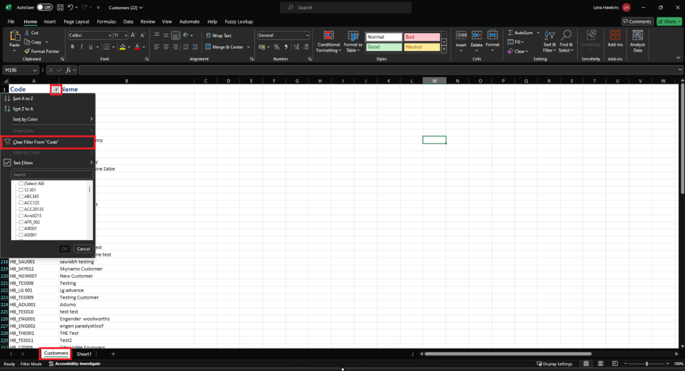Open the customer list and click Enable Editing at the top. Then, delete all of the columns except your "Code" and "Name" columns so that it looks like the below: