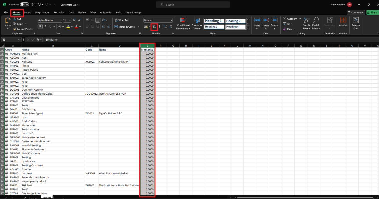 Select the Similarity column (Column E), click on Home and change it to Percentages: