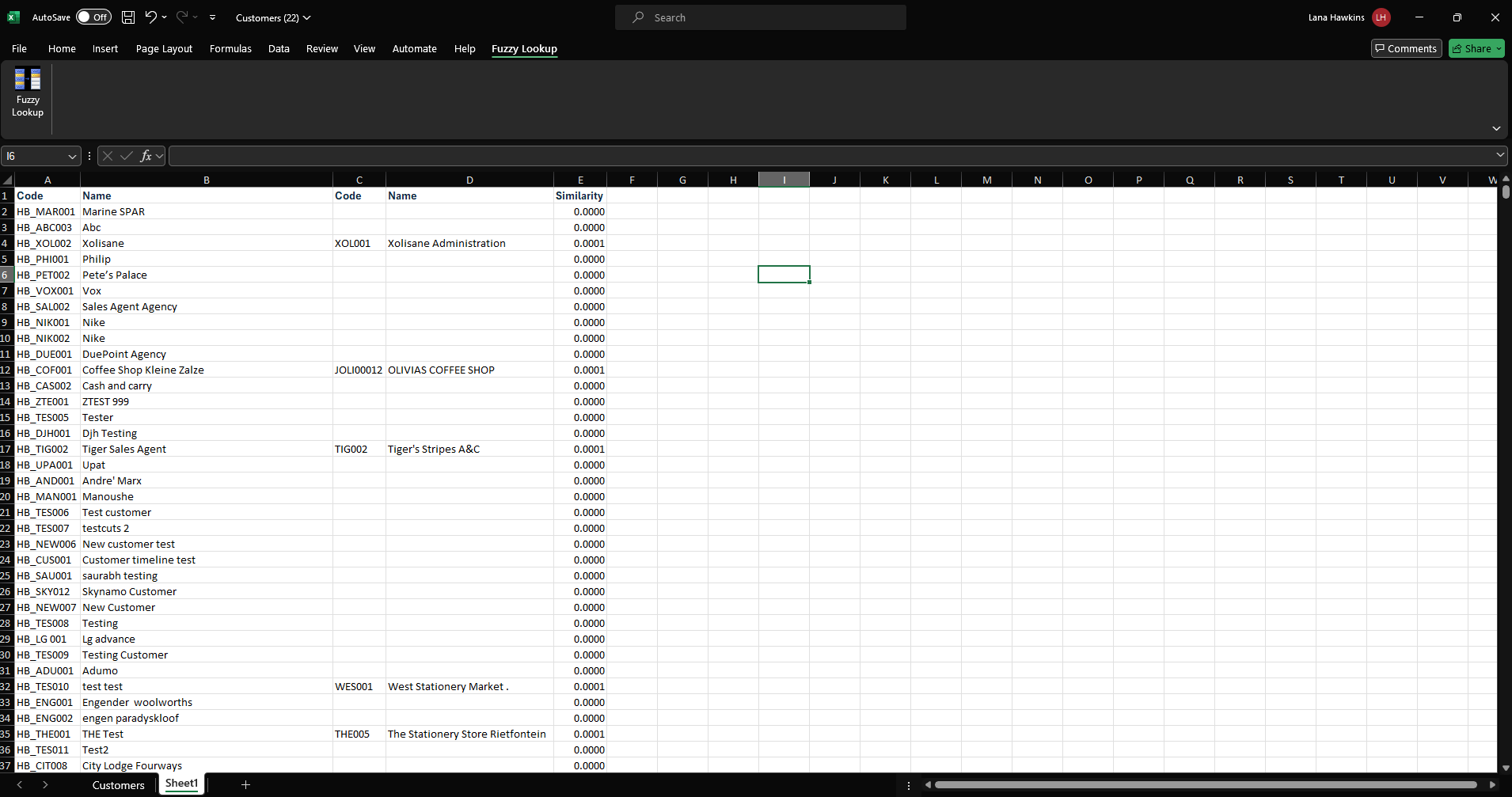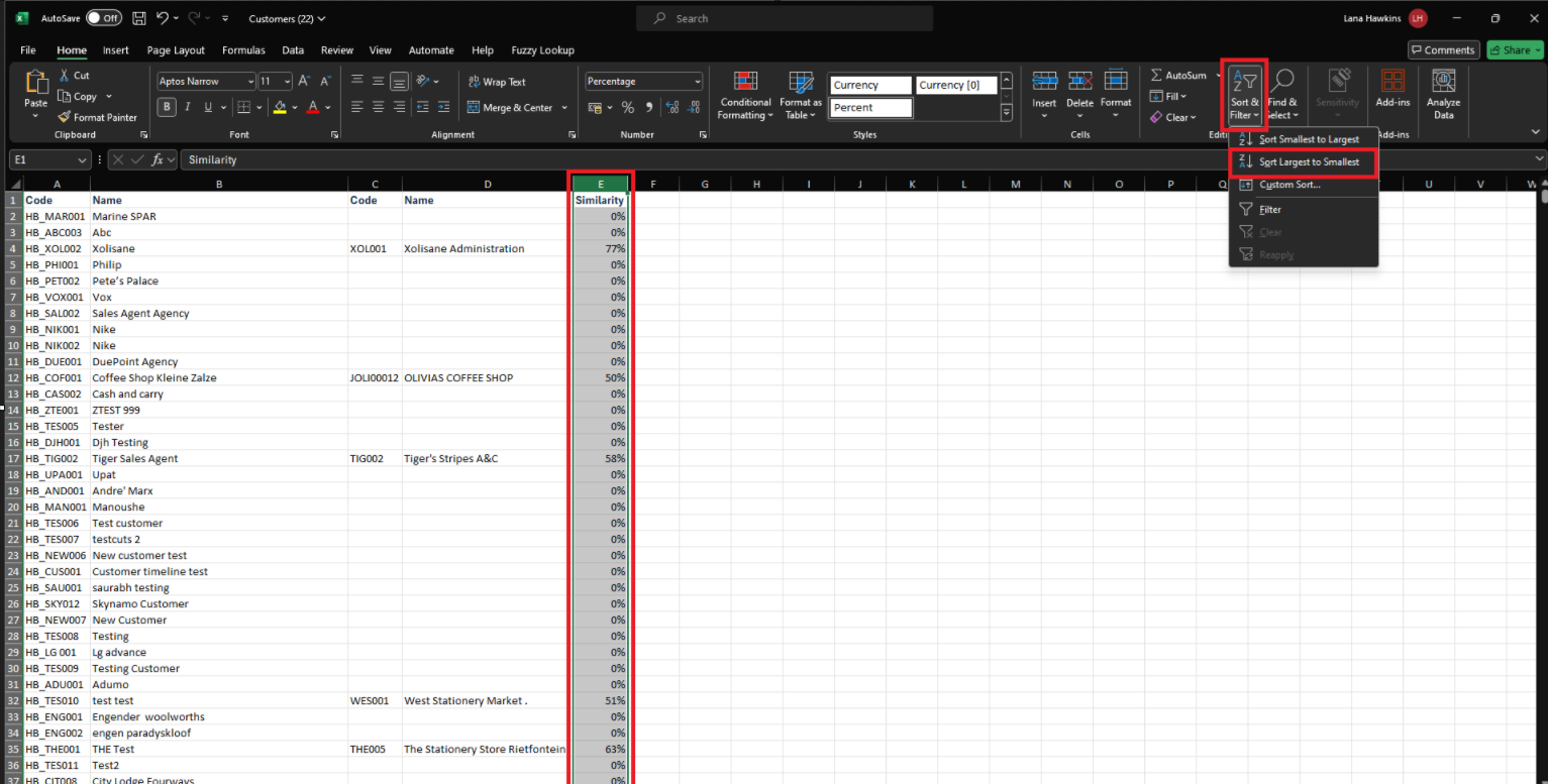 You will now have a list from most similar by name to least similar by name that will help you identify which customers are similar enough to merge.