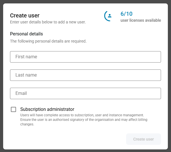 - You can then enter their user details and indicate whether you want them to be an Subscription administrator. Once you have done so, click on Create user: