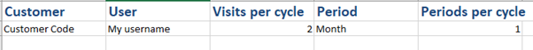 You will then choose how often you want to visit the customer per cycle. The period column is where you decide if you are setting up a weekly or monthly cycle and can only contain the values "Week" or "Month". The periods per cycle is how many weeks or months you want to plan for. To use an example, if I want to see a customer every 2 months my Period will be Month and my Periods per cycle will be 2.