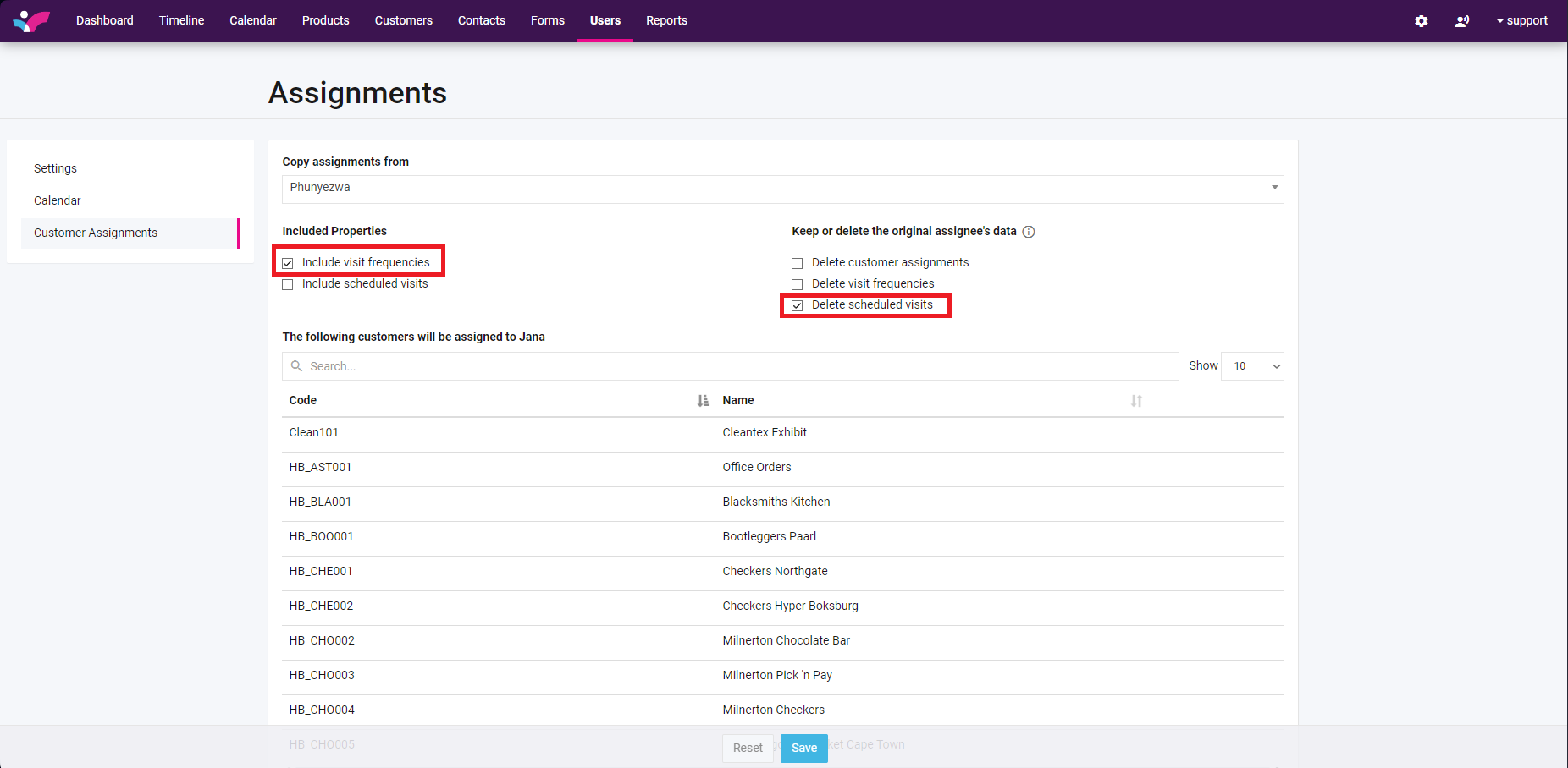 To the right you can choose if this process should remove the customer assignments, set visit frequencies or the planned visits for the original user.