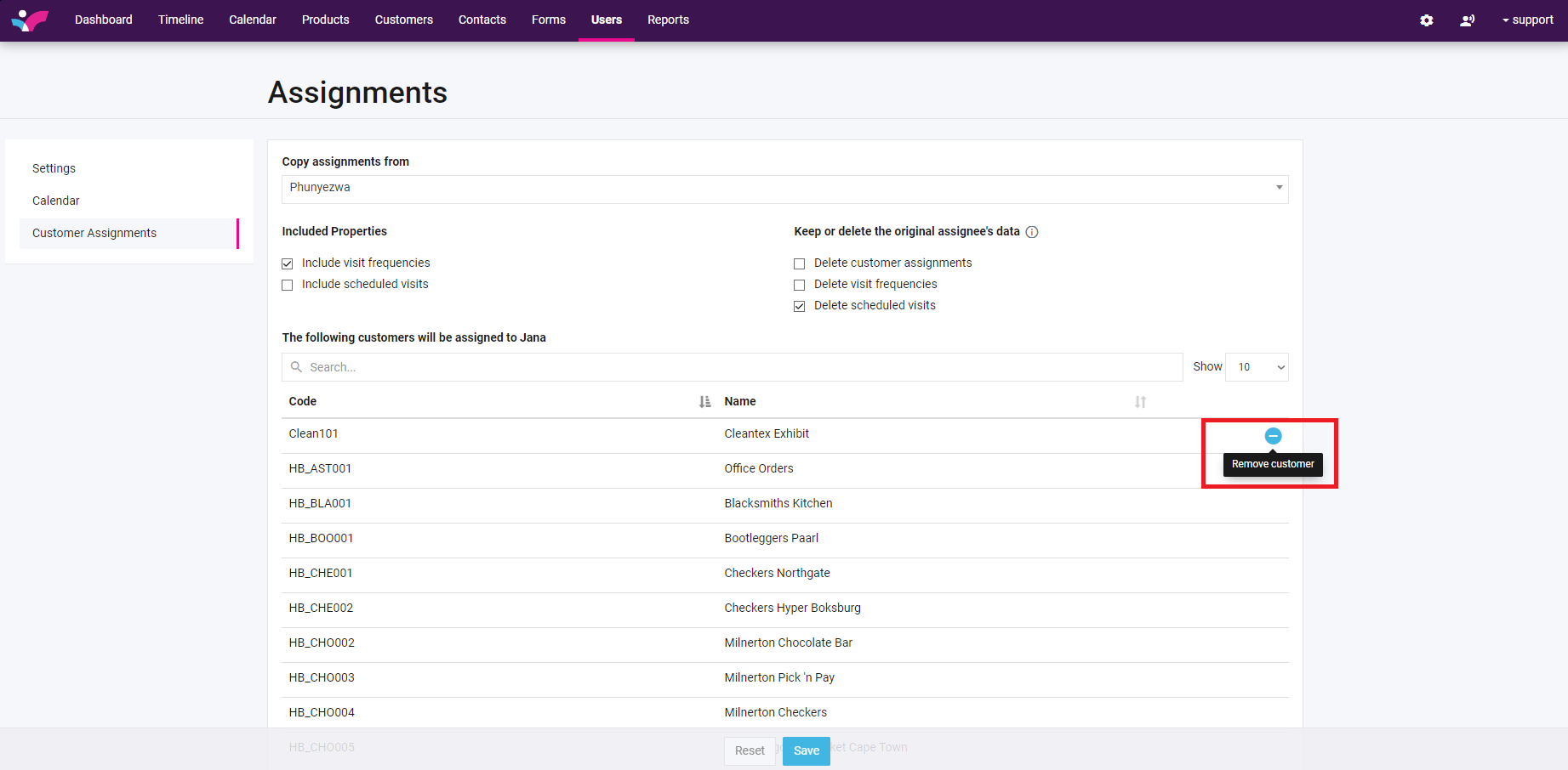 Once you have chosen the user to copy assignments from, and what should be included, you can search or scroll through the list of customers to be assigned and remove any that should not be assigned.