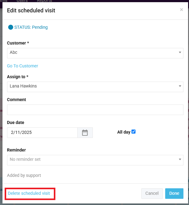 22 January 2026 How to delete a scheduled task/visit - Web 1. On your Skynamo web interface, navigate to the Calendar tab: 2. Click on the task/scheduled visit that you wish to delete 3. Click on the delete button at the bottom-left: