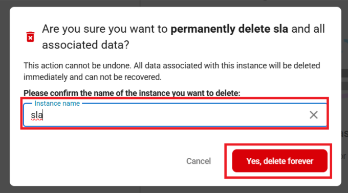 - Type in the instance name exactly as it is displayed and select Yes, delete forever: