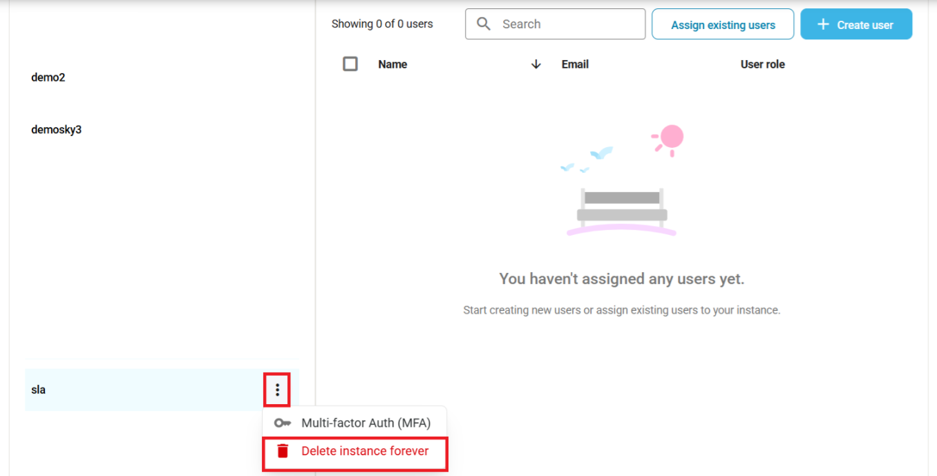- Click on the 3 dots next to the instance that you are trying to delete and click on Delete instance forever: