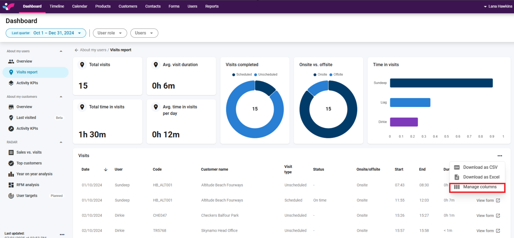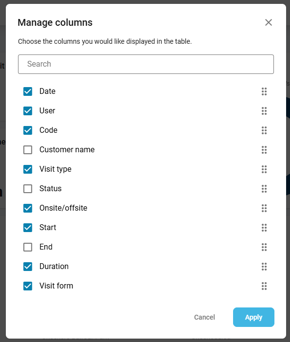 5. Select Manage columns to choose which columns are displayed in the table and the order in which they appear. Click the blue Apply button: