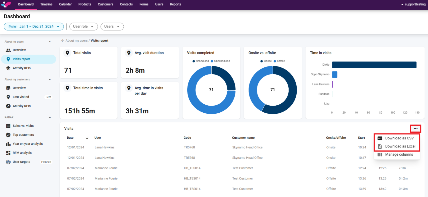 5. To download the report as Excel or CSV to your device, click on the 3 dots and then select your option. The file will be downloaded to your Downloads folder: