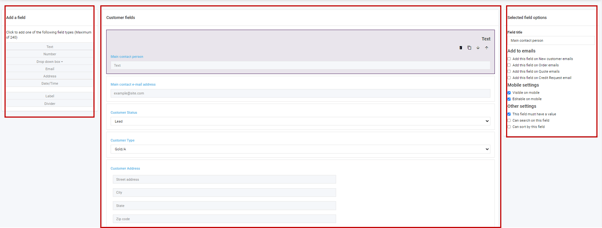 Customer fields can be customized by adding new fields in normal text, number, drop-down boxes, date and time, email, and address fields.