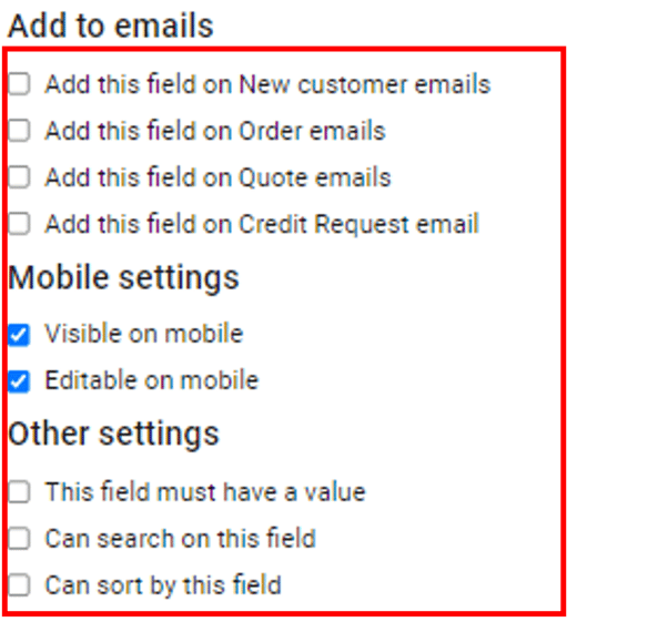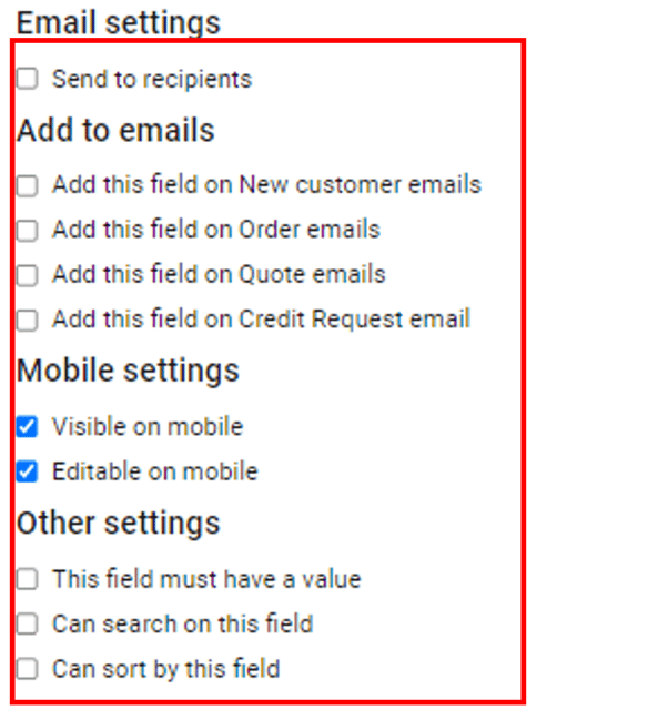 Mobile settings – if these boxes are both ticked then the mobile user can freely use this field from the front end. To restrict usage; deselect accordingly.