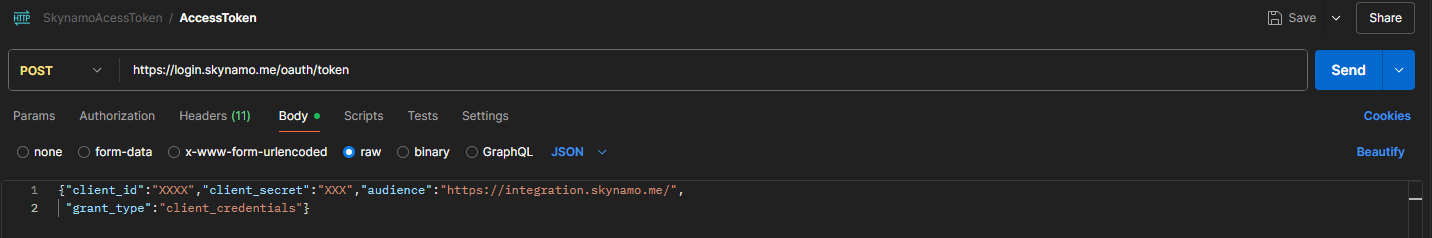 - {"client_id":"XXXX","client_secret":"XXX","audience":"https://integration.skynamo.me/",