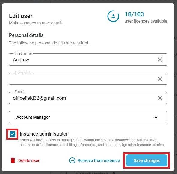 - Tick the Instance administrator box and click on Save changes:
