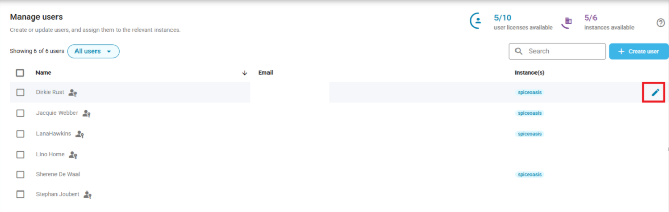- Hover over their name with your cursor and click the Edit user (blue pencil) icon: