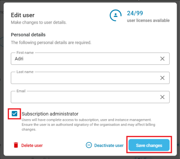 - Tick the Subscription administrator box and click on Save changes: