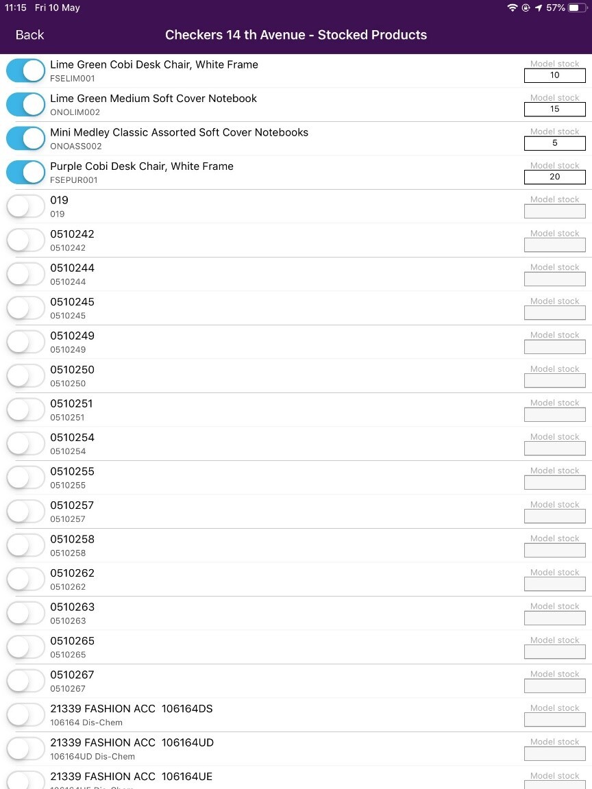 Setting up the model stock can also be done by management on the Skynamo insights (web interface), by going to the customer's profile, navigate to Model Stock and entering the correct amount.