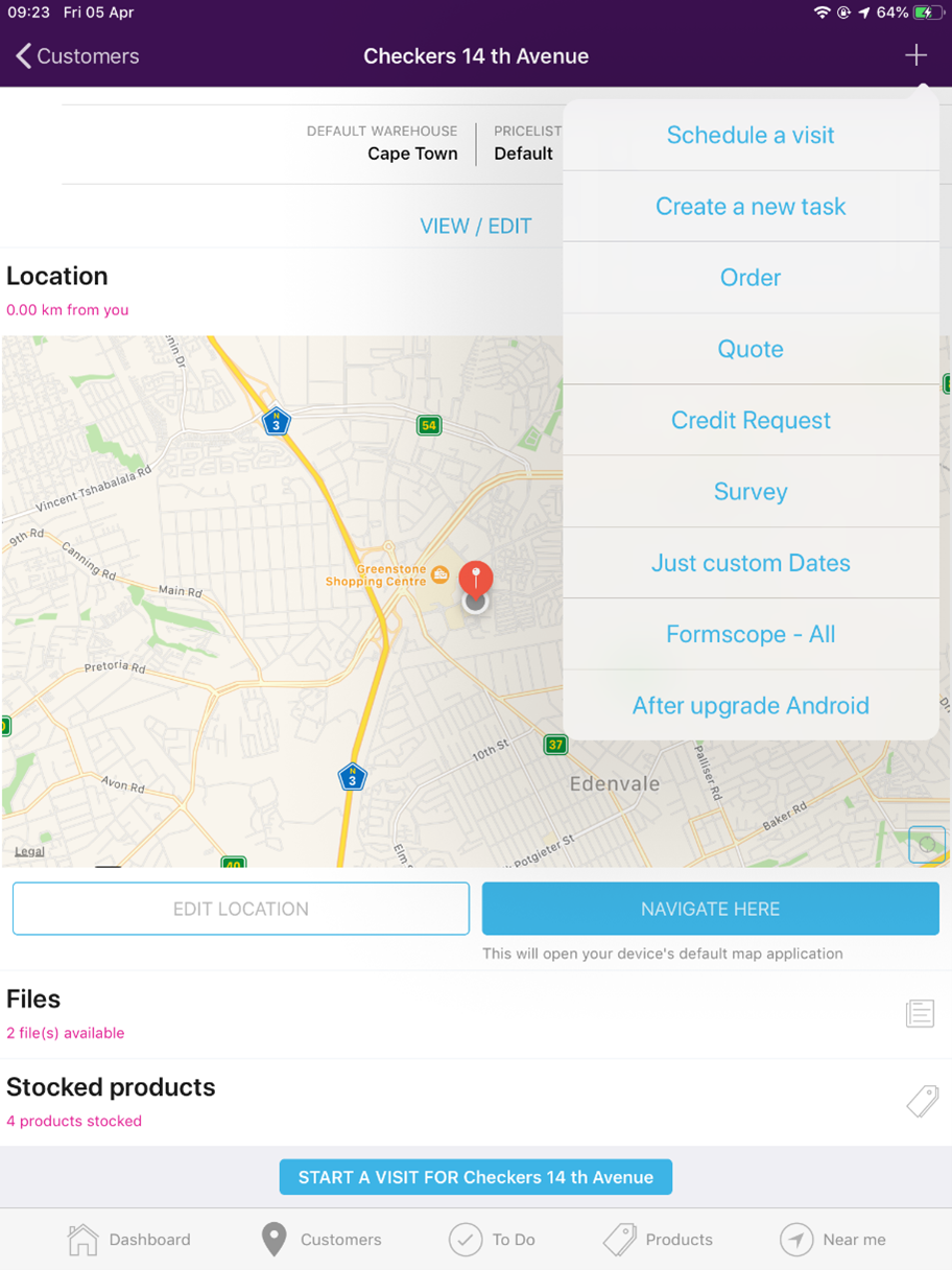 The next thing you will need to do is to add a survey (stock take) from your menu on the customer’s profile. This will indicate the current stock level. See below screenshot of where to find the survey: