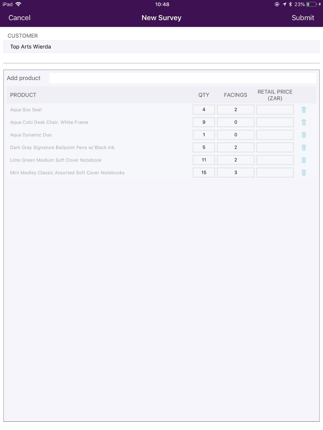 Once you have selected to start the survey you can add the figures. The Qty in stock will be the current stock that the customer has. This should be the total stock on hand. Facings are important in some industries and this is an optional figure you can add. Facings are used when you have a certain number of products on the shelf (For example 10 Aqua Box Seat) but only some of the products are visible because they are in the front of the row on the shelf (In the case below 2). Finally, you can add the retail price should it be required. This will be the price the customer is selling your product at. Once you have added all the information required you can click on Submit to finalize the stock take.
