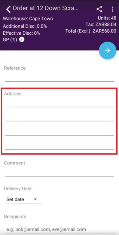 1. When filling out a form, such as an order or a quote, click inside the Address field:
