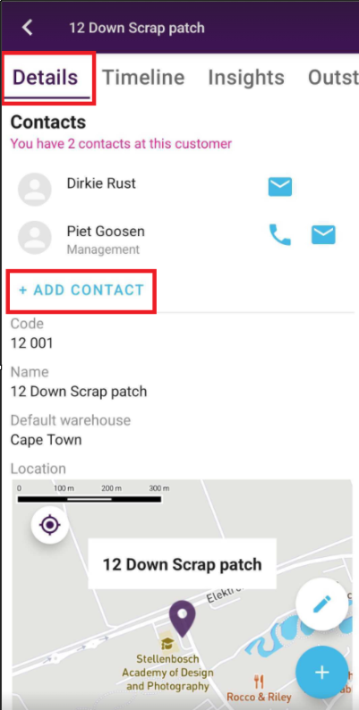 2. On the Customer's Details page, click on Add contact: