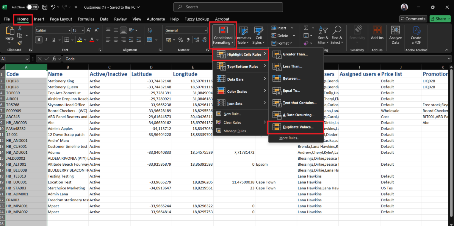 This will highlight all of the duplicates in the file for you. You can then Sort & Filter from A-Z so that they are together in the file.