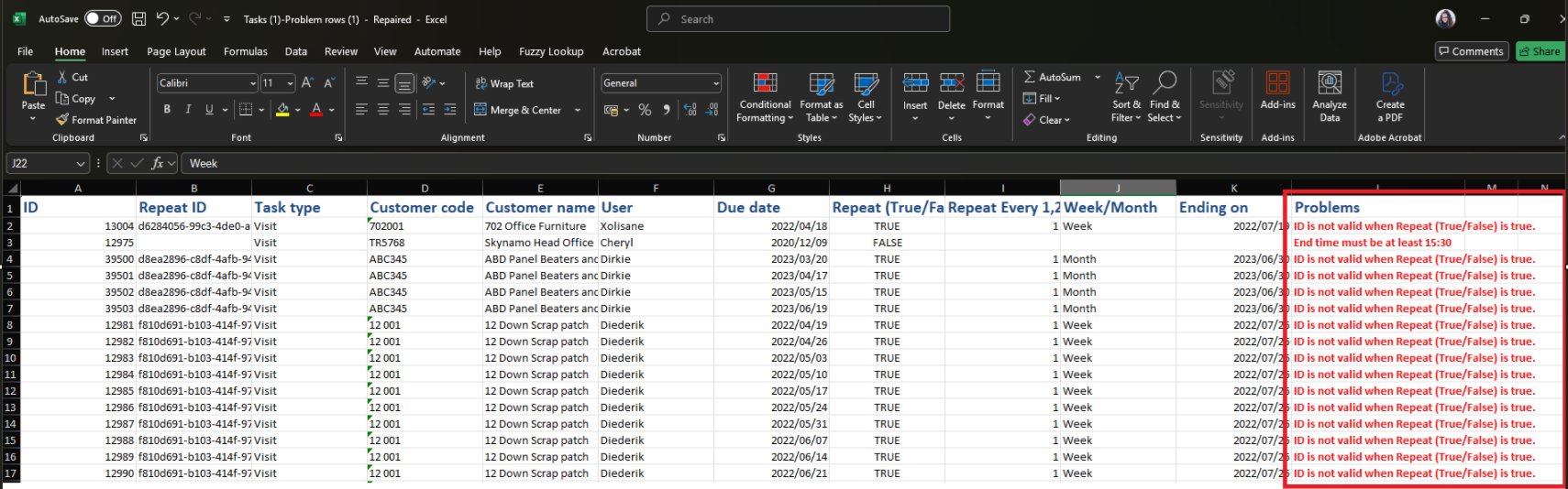 - Duplicate customers/products/tasks in file: This means you have the same product code or customer code in your file more than once.