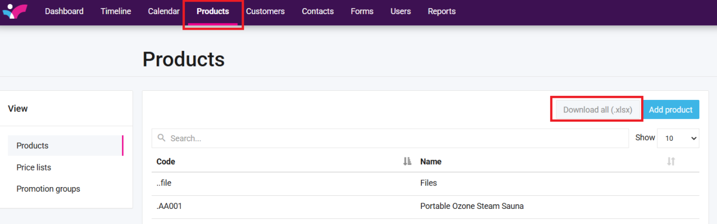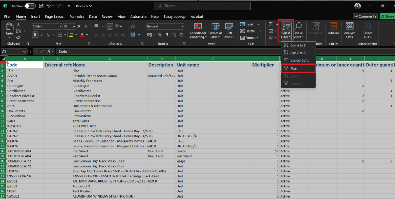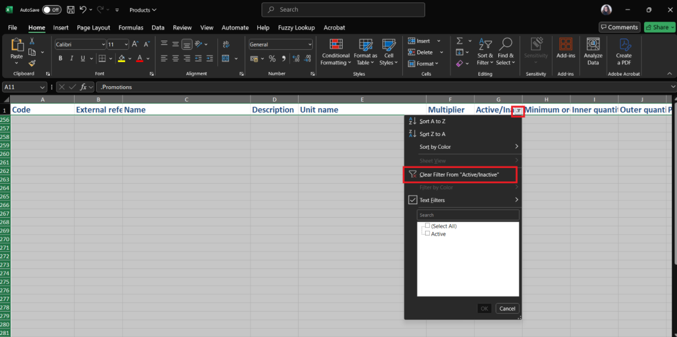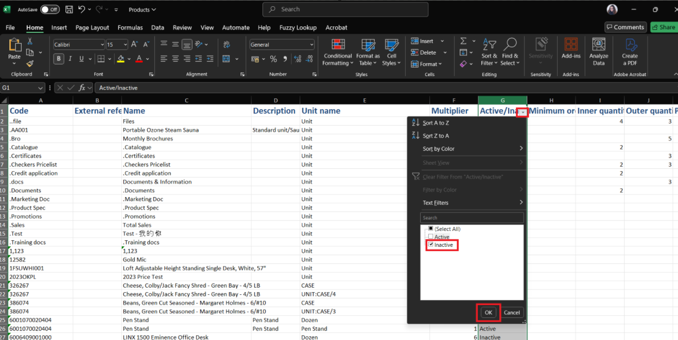 - In the Active/Inactive column, filter by Inactive Products and delete these from the list so that you are only working with Active Products