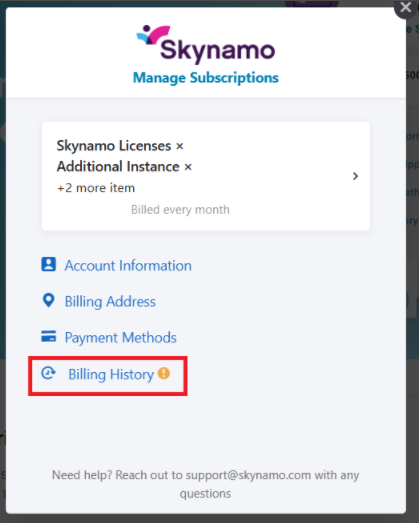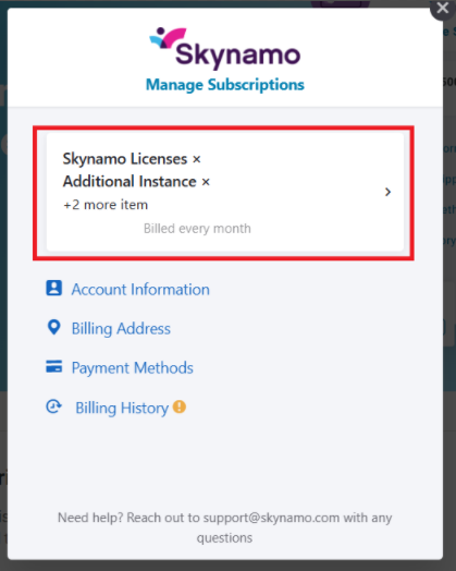 - At the top, you will be able to see your Skynamo licenses, additional instances, additional add-ons, and how much you are billed each month (Please note that sensitive information was not included in the below screenshot):
