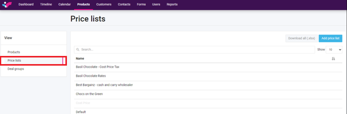 1. Navigate to your Products tab, and to your Price lists section. Here you will find the option to Add price list.