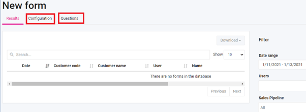 - When you are done editing the form, you can click create, this will save the form and open the form results. The form results will be empty since no one has completed the form yet. Then click the form questions to review the questions you added or skip to the form configuration for our next step.