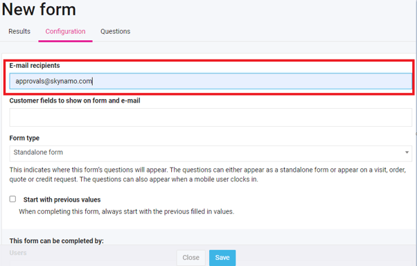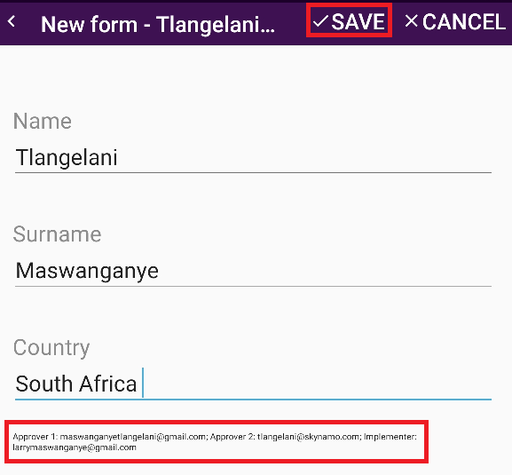 - When you are done editing the form, ask your users to sync their devices so that they can have the latest information from the server, including the form. The form will have the intended approvers and the implementer's email addresses. After your team then completed this form they would just click on Save to submit the form as they would with any normal form.