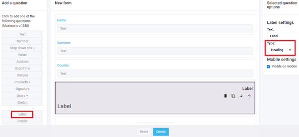 - After adding all your questions and renaming them, you will then need to add a label at the bottom of the form. After adding the label, change the font type to the fine print type.