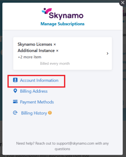 - At the top, you will be able to see your Skynamo licenses, additional instances, additional add-ons, and how much you are billed each month (Please note that sensitive information was not included in the below screenshot):