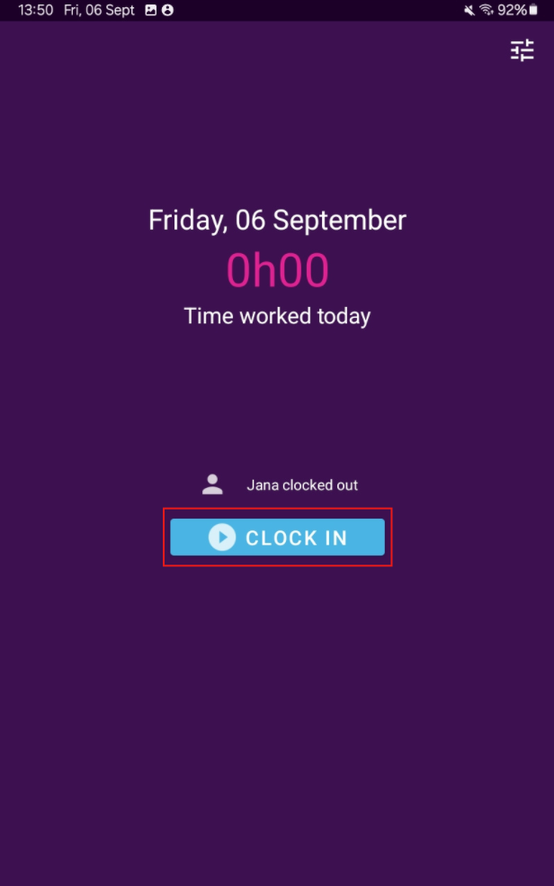 When you open the app (after logging in), tap on the “Clock in” button: