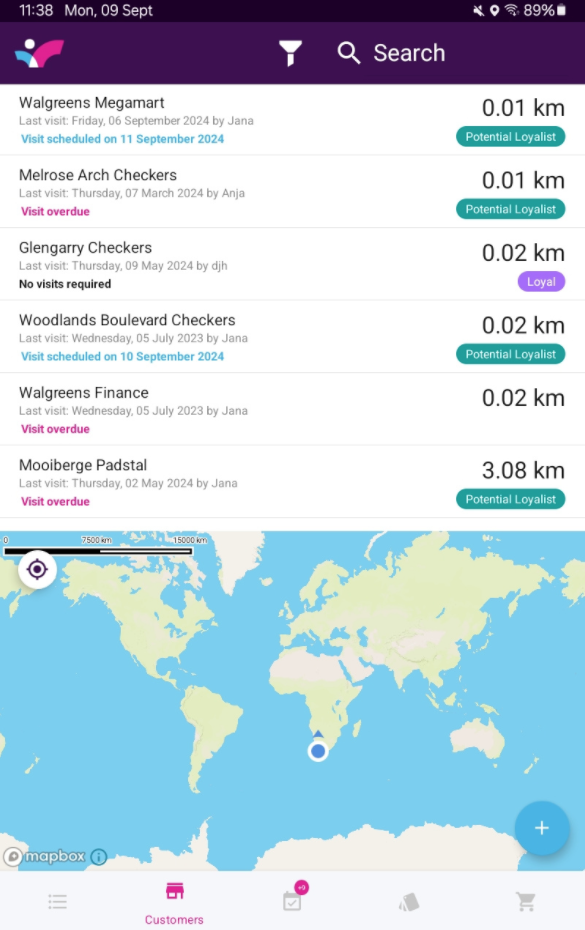 - Start visit button: Tap here to begin a customer visit