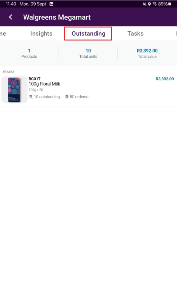 Finally, next to the “Insights” tab is the “Outstanding” tab. On this page, you will be able to see the ordered items that are outstanding, their quantity and total value.