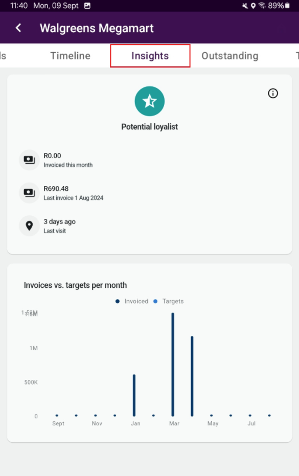 Next to “Timeline” is the “Insights” tab. On this tab, you will have access to the RFM Analysis which we call Skynamo RADAR (only available for customers who have subscribed to it) and Sales Overview on a bar graph displaying buying history if sales data is added.