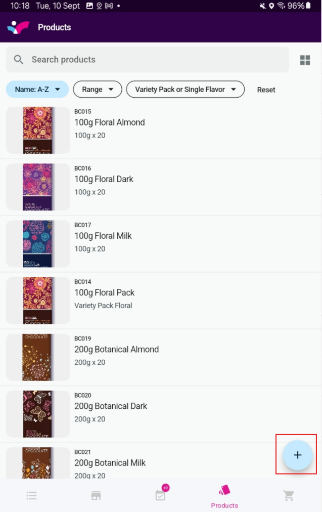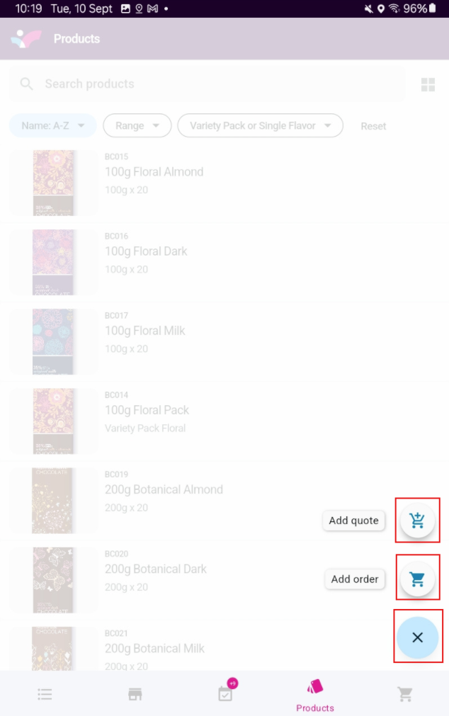 Tap on the plus sign at the bottom right of the products page to start an order or a quote