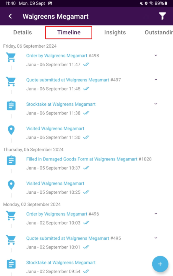 - Activity Timeline: View all interactions such as visits, orders, and forms. Only the last 100 tasks will show; you can also filter by the last 100 interactions of a specific type.