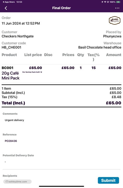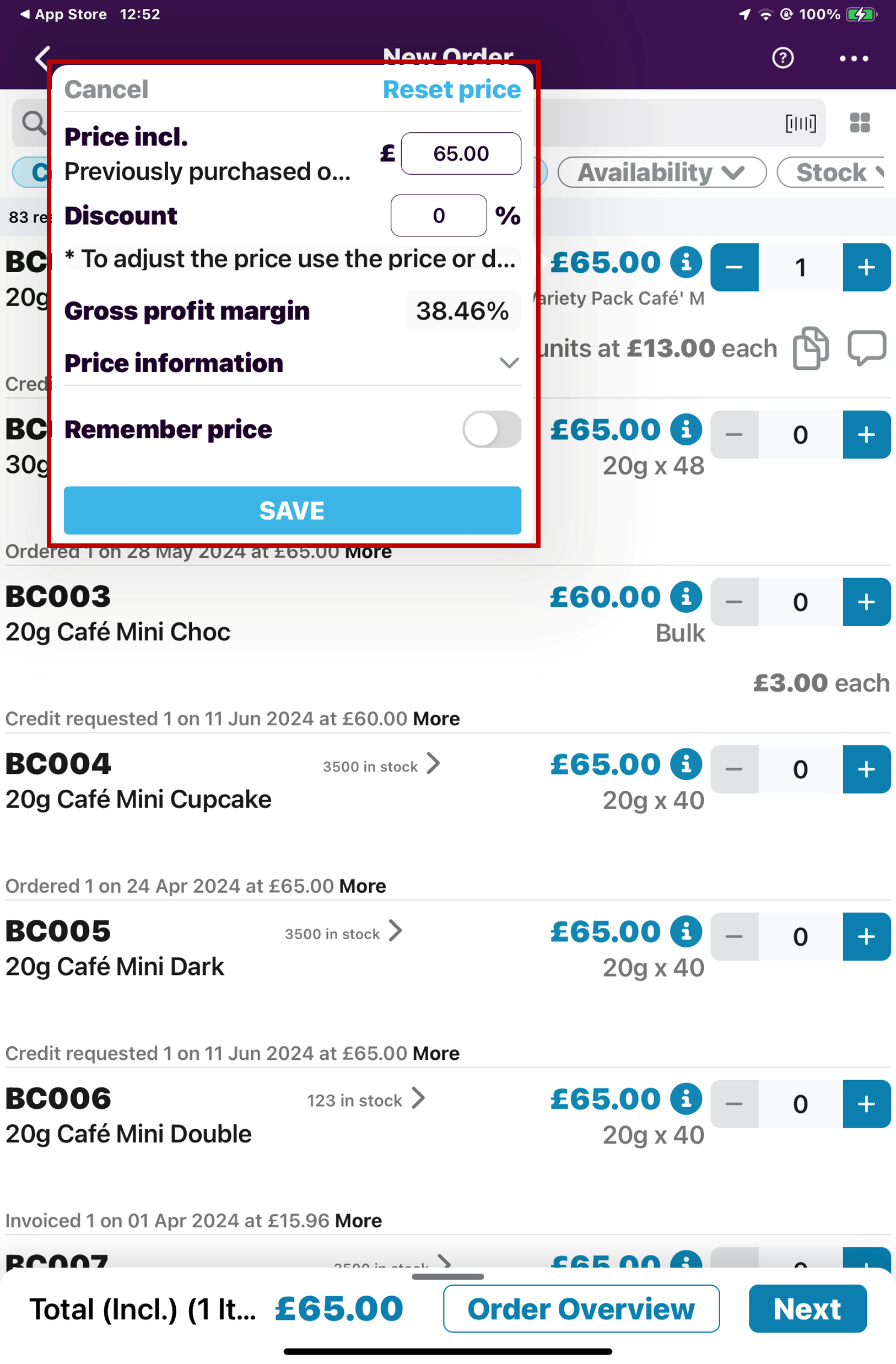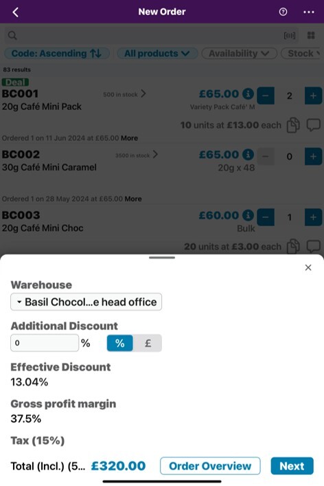Click on/expand the info bar at the bottom of the screen to view the current basket for your Quote or Order. You can also change the Warehouse from here if needed and you have the option to add a discount for the full Order or Quote from here as well if you have the required permissions to do so.