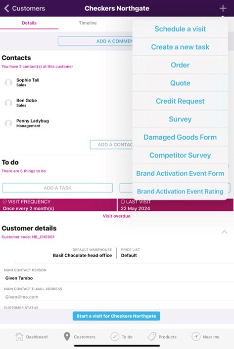 To start placing an Order, Quote and or credit request, proceed to your customer profile and select the + button in the top-right. Select Order, Quote and or credit request to get started.