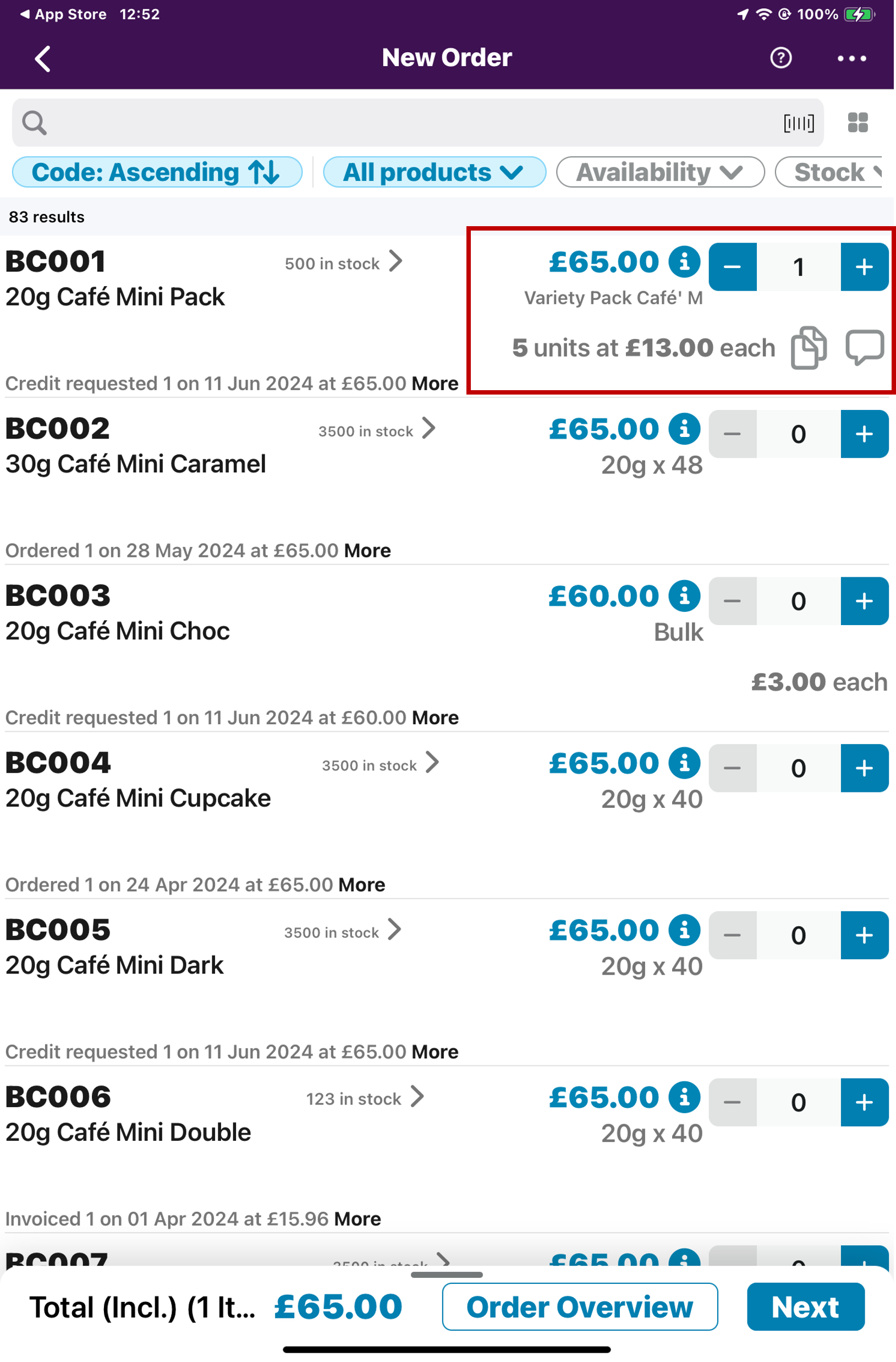 This will take you to the catalogue view, displaying your product images, details, pricing and stock level. Click on any of the images to enlarge them. You can also add quantities from here by clicking on the quantity block like we did earlier, or selecting the blue +.