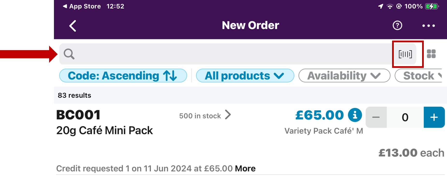 You can also search for products using the search bar by simply typing in the product name or code. On the far right of the search bar, you will also have the option to use the barcode scanning feature if you have barcodes set for your products.