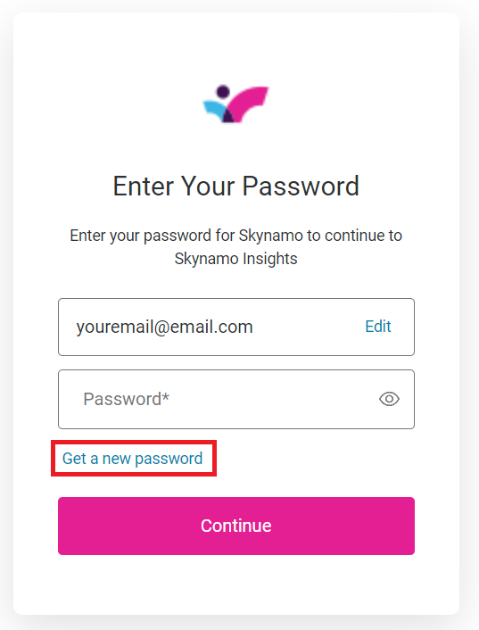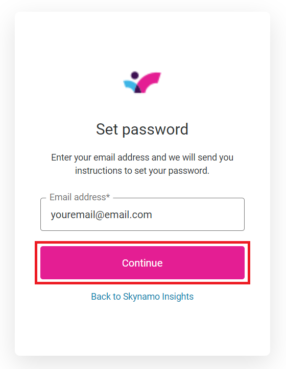 1. Fill in the email address associated with your Skynamo account on the first login screen, then select Continue: